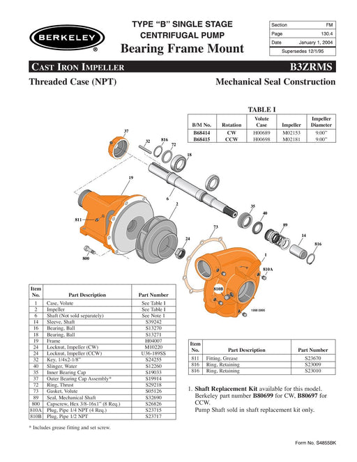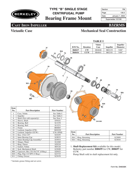 Please call the office @ (813) 704-4849 to order with LTL shipping Berkeley B68416,Type “B” Frame Mount,3 Discharge In.,4 Suction In.,9 Impeller In...